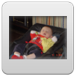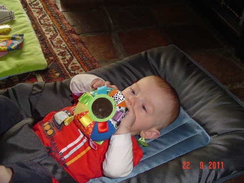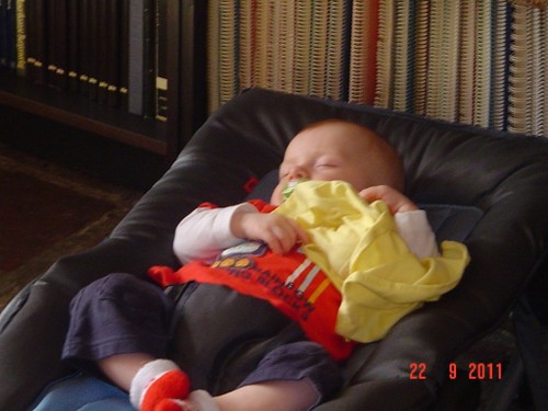 Omadien legt me in m'n maxicosi, dus ik ga met mijn papa naar huis. Ik heb vandaag een hoop gespeeld en geknuffeld en gekletst en oranje smurrie gesaboteerd en als ik kan praten vertel ik mijn mama en papa de mop van de worteltjestaart. Het was dus een drukke dag.