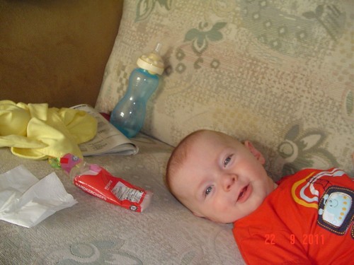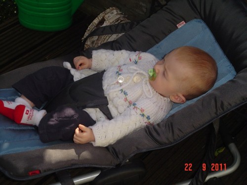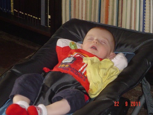 Huilen, gauw weer op schoot. Na een kwartiertje een fikse boer en dan valt Bart vrijwel direkt in slaap. Even op de bank liggen, dan maakt omadien de wipstoel plat. Bart slaapt door. In de wipstoel, Bart slaapt door. Omadien gaat spullen uitpakken en klaarleggen.