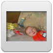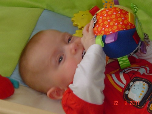 Ik ga even mopperen om te zeggen dat het weer tijd is voor de fles. Ja dat snapt omadien wel. We gaan naar binnen en in de keuken wordt gelijk mijn fles klaargemaakt. Doorwerken, daar hou ik van. Nog even op het aanrecht zitten tot de fles warm is. Door dat raam is altijd een hoop te zien en ik mag nu ook de kraan vastpakken. Zo, fles klaar, gauw naar binnen slobberen, klok-klok. Hèhè dat doet een mens goed, even een flinke boer en dan kan ik weer een hoop kletsen en spelen in de box, terwijl oma de fles opruimt. O ze is al terug, nu krijg ik een schone luier, mooi dan kan ik weer haren graaien en kraaien en blubberknuffels geven. En dan ga ik met omadien weer rollen op het kleed en we doen nog een hoop andere dingen. Omadien zegt dat ik altijd even moet doorrollen, dan zijn allebei m'n armen los. Makkelijk gezegd, da's best een moeilijke truk! Nu ga ik nog even rustig spelen in mijn box met mijn bal, knisperboek en sokken.