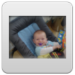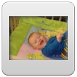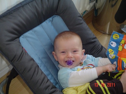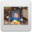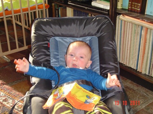 Weer in de wipstoel, dat vindt meneertje toch ietwat prettiger. Bart ligt te grijnzen, in z'n open te wrijven, te kletsen en te spelen.