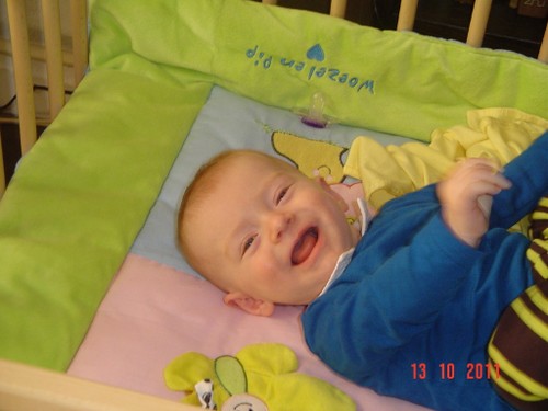 Wakker. Wil niet spelen, alleen op schoot hangen en in z'n ogen wrijven. Na een kwartiertje weer in slaap, maar als ik hem terugleg, wordt Bart wakker en is boos.