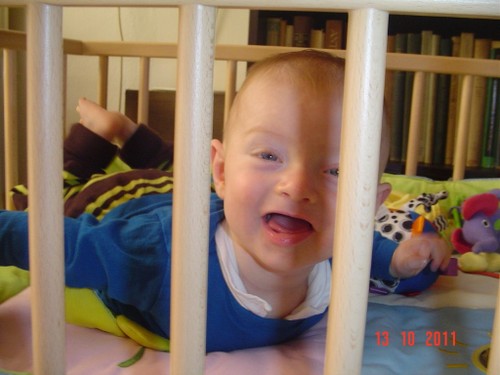 Bart wordt met een grote grijns wakker en gaat spelen met z'n bal, rammelaars en kletst.