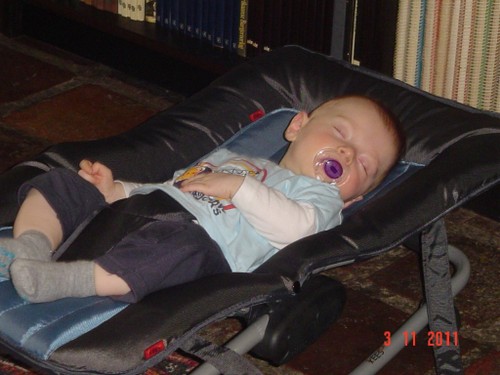 Weer boos, op schoot in ogen wrijven en binnen 1 minuut in slaap. Hij ligt tevreden te kreunen en dan in de box. NEE, ik wil niet in de box slapen!!! Bedje boven kan ook niet, want daar moet hij niets van hebben, maar omadien heeft nog een andere optie: de wipstoel en daar ligt Bart prinsheerlijk.
