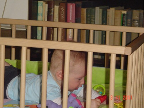 Ik ga met de buggy naar het balkon om die alvast in de tuin te zetten, we willen wandelen. Ik ben nog niet buiten of het gaat weer regenen. Shit. Bart moppert af en toe, dus we gaan samen op het kleed spelen. Bart wil zitten!!! De wereld ziet er dan een stuk overzichtelijker uit dan wanneer je ligt. Hij voelt met een plat handje aan het kleed en krast met z'n nageltjes: niet interessant, het maakt geen geluid! Al het speelgoed heeft hij nu wel gezien, ik moet duidelijk nieuwe spullen aanschaffen. Rechtop staan oefenen is helemaal mooi, reflexen beginnen te werken.