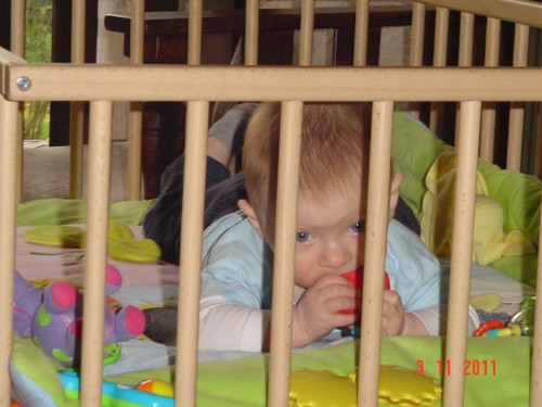 Na een beetje protest speelt Bart nu weer in de box, speelt met bal, weer oefenen met duim/wijsvinger om de lintjes te pakken. Rolt ook steeds om en probeert om speelgoed dat buiten bereik ligt te pakken. Frustrerend.