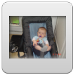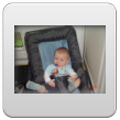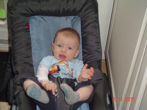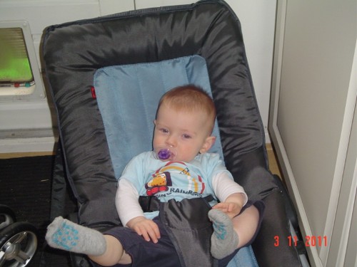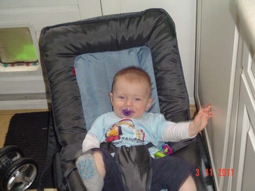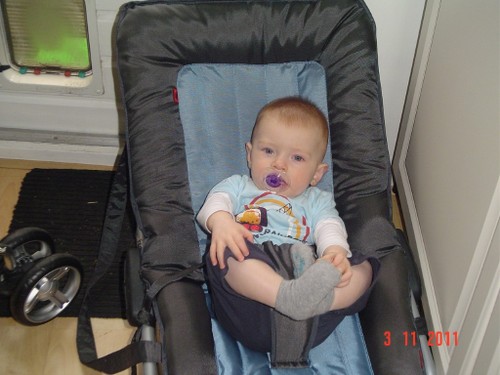 Blijft knorren terwijl ik hem in de wipstoel installeer.