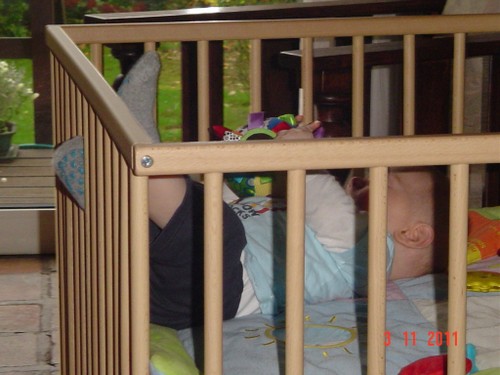 Na uitzwaaien van mama is Bart bijna direct op schoot in slaap gevallen, dus op z'n zij in de box.