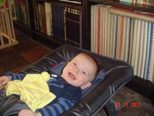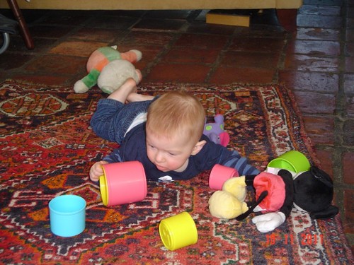 Op is de hap. Bart zit te knetteren en te kletsen op schoot. Daarna verder spelen in de box terwijl ik de boel opruim. De box is eigelijk te klein voor al Bart's capriolen, dus gauw weer op het kleed. Door om te rollen, dweilt hij alle kanten op behalve naar voren. Bart kreunt en steunt en probeert blokken te pakken die net buiten z'n bereik liggen. Het helpt niet, hij krijgt z'n lijf niet in z'n vooruit. We gaan even wat spiergevoel en reflexen van benen oefenen. Bart is enthousiast, lacht en kraait. Daarna weer verder spelen in een opperbeste stemming. De snorharen en de staart van de speelgoedmuis worden nauwgezet geïnspecteerd. Een rammelaar? Nee hoor, da's saai, weg ermee, da's voor baby's. Blokken en af en toe een boekje of speelgoedbeest is veel leuker.