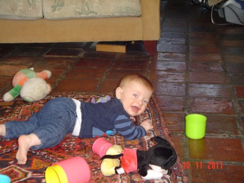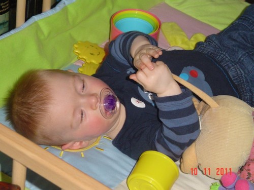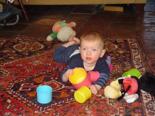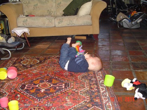 Bart moppert, op schoot, af en toe lopen, dan weer spelen op het kleed, blokken zijn favoriet, vooral omgooien is mooi. Af en toe een beetje slijm opspugen, weer mopperen en op schoot.