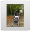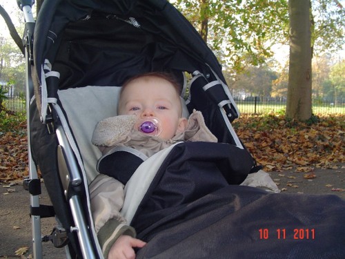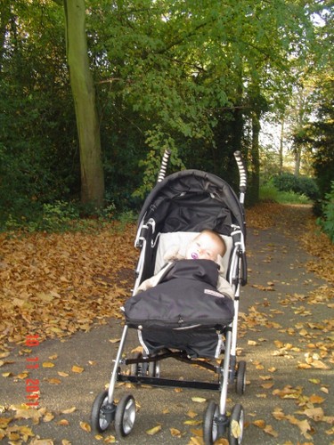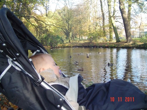 Weer ineens huilen, op schoot en daar zit Bart te knetteren, pffff. Tijd om te gaan wandelen. Jas aan en in de buggy naar buiten. Bart zet z'n bestudeergezicht op, armen op het dekje en kijken en kijken.