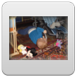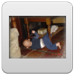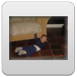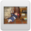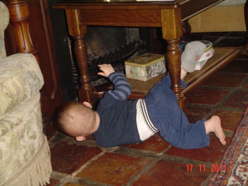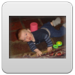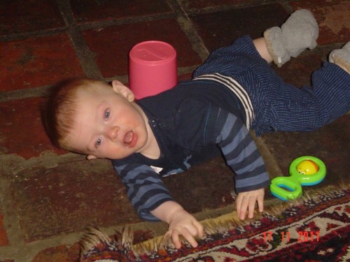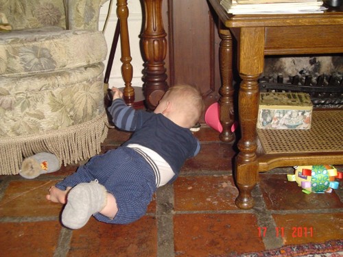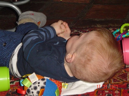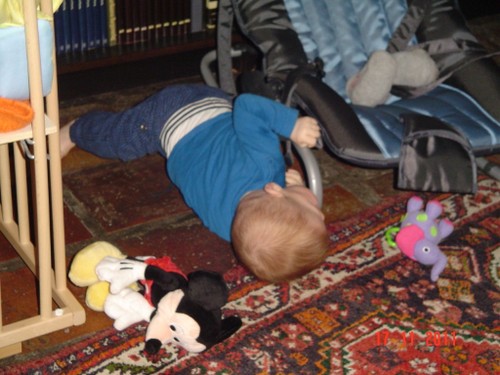 Wakker met een grote grijns, begint te kletsen. We gaan spelen op het kleed en na een half uurtje, als Bart te kennen geeft dat hij "iets wil hebben", in de buggy naar de keuken om diksap te maken. Op schoot opdrinken. Bart pakt fanatiek zelf de beker bij de oortjes en als het aan hem ligt, slaat hij de hele zaak in 1 x achterover. Da's niet de bedoeling baasje, rustig aan, zo verslik je je. Daarna nog even spelen met de slab, leuk! kun je mee zwaaien. Verder op het kleed, Bart dweilt heen en weer, pakt van alles vast, onderzoekt stoelen, wipstoel, box en probeert natuurlijk allerlei andere zaken te pakken maar dat vind ik weer niet goed en leg hem weer terug op het kleed. Bart vindt het best en begint opnieuw. We oefenen de kruiphouding, knietjes onder de heupen, maar dat is voor Bart alleen nog te moeilijk, adductoren zijn nog niet sterk genoeg. Volgende keer verder oefenen.
