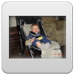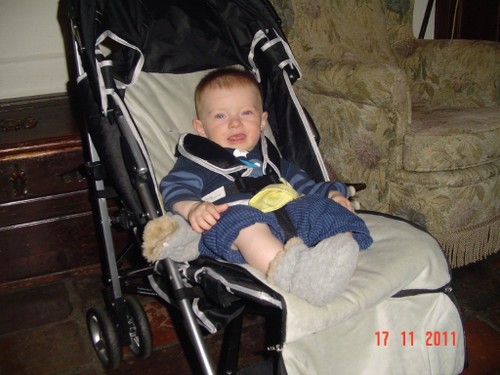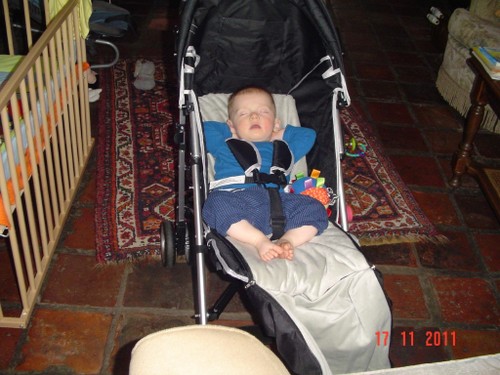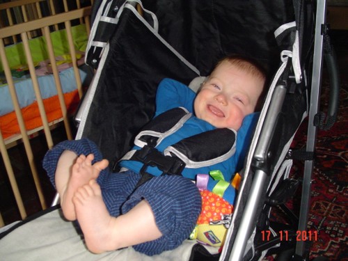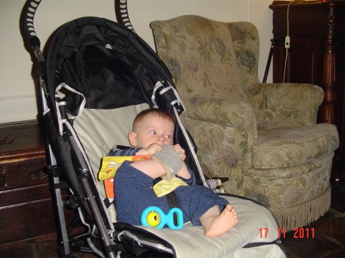Bart wordt weer mopperig. Oeps, schone luier vergeten, gauw verhelpen, niet echt kletsnat. Daarna pas ik de grote truc toe: beetje diksap uit de beker. Smak-smak. En dan moet ik toch echt iets eten maar ik kan de atleet niet alleen in de kamer laten, voor je het weet ligt hij in de open haard. Dus in de buggy naar de keuken, veel beter dan sjouwen met de wipstoel, bovendien kan hij nu meer zien. Bart kijkt hoogst geïnteresseerd naar alle handelingen, brood smeren en eten, melk drinken, omadien is net een mens, Bart kijkt met een scheef hoofd en geeft commentaar. Dan fles schoonmaken en weer naar de kamer.
