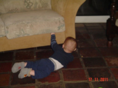 Weer een paar slokjes water op schoot en dan wil Bart weer spelen. Dweilt weer de hele kamer door en steunt en kreunt onderweg. Soms komt hij iets belangwekkends tegen onderweg, draait op z'n rug en pakt een speelgoedbeest en met z'n voeten een ander beest. Net een aapje. Af en toe probeert hij met alle macht vanuit ruglig overeind te komen, maar komt niet verder dan schouders van de grond, dat houdt hij secondenlang vol en steunt dan als een pakpaard. Hij krijgt nog een echt wasbord!