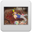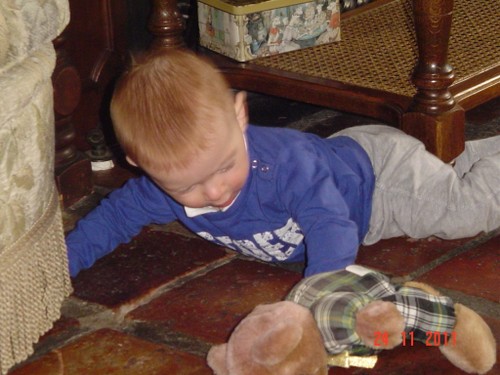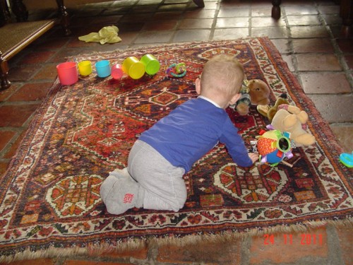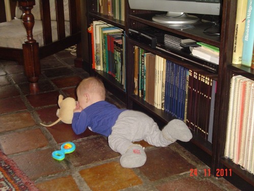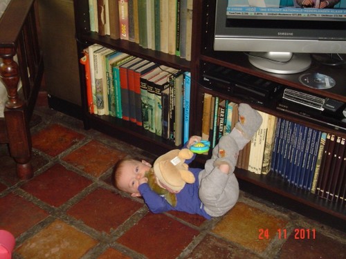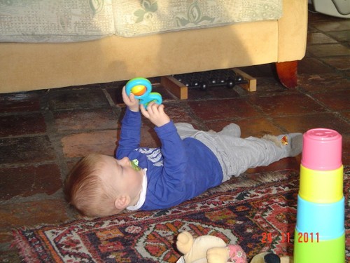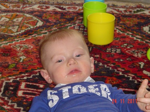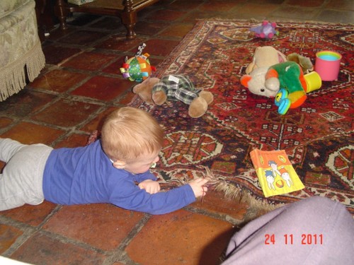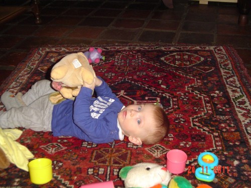 Als de fles leeg is, is Bart even boos, wil meer! Even op schoot knuffelen en dan lacht hij weer. Daarna weer spelen, kletsen en knetteren. Goed in de gaten houden want in een mum van tijd rolt hij van de ene naar de andere kant van de kamer en alles moet onderzocht worden (lees: besabbeld). Nee, niet de draadjes van het kleed!! Bart is niet rancuneus en speelt gewoon weer met iets anders en dweilt van hot naar her.