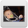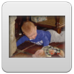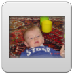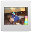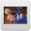 Weer thuis, Bart diep in slaap, maar wordt deze keer wel wakker als ik z'n jas uittrek. Nog even proberen of hij verder wil slapen, maar nee. Dan wat water drinken op schoot en verder spelen. Buikhappen: Bart schatert.