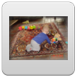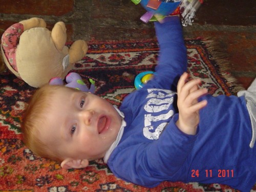 Weer even spelen op het kleed, de speelgoedmuis is vandaag favoriet want die sleept hij overal mee naar toe. Maar niet te lang spelen want anders gaat hij weer om eten mopperen.