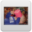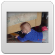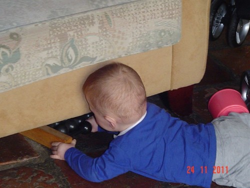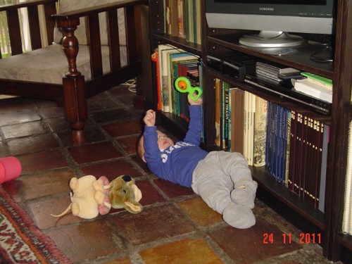 Wakker, hi ben je daar weer? grijnzen. Even weer wat diksap in de keuken en dan weer spelen, kraaien, lachen, kletsen. Af en toe neemt hij even pauze om op handen en knieën heen en weer te schommelen: een Bart-oefening. Als we samen oefenen kan hij wel z'n knieën naar voren zetten, maar dan "vergeet" hij dat z'n handjes ook naar voren moeten, als ik hem niet vasthad zou hij zo op z'n bekkie gaan. Nee, dat gevoel zit er vandaag nog niet in maar dat kan nooit lang meer duren. Nog een Bart-oefening: buikspieren trainen met flink wat gesteun, er wordt gewerkt aan het wasbord.