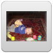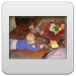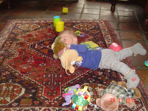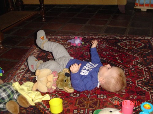 Bart ligt te knetteren en gaat huilen, gauw op schoot. Mannetje begint moe te worden en wrijft in z'n ogen. Na een kwartiertje weer helemaal alert dus verder spelen. Hij knettert nog steeds maar nu blijft hij gewoon lachen en kletsen.