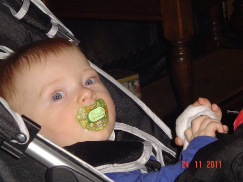 Wakker, ik laat hem nog even in de buggy liggen tot hij helemaal bij de tijd is; Bart speelt met z'n gele popje en fopspeen.