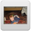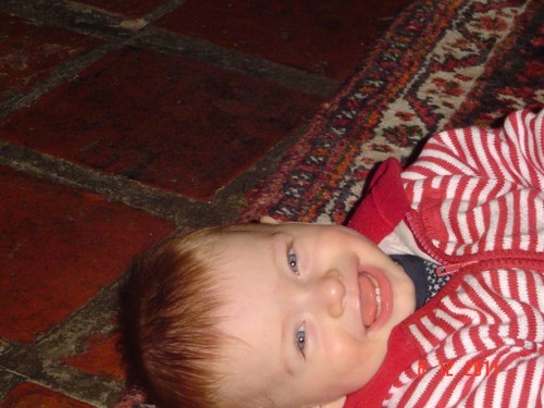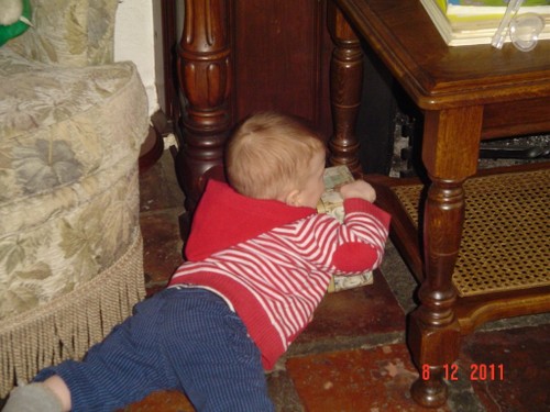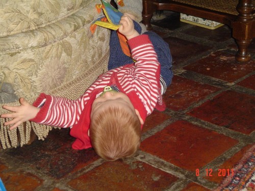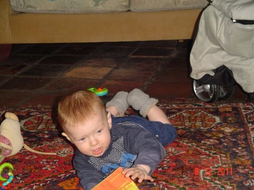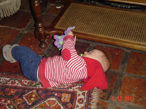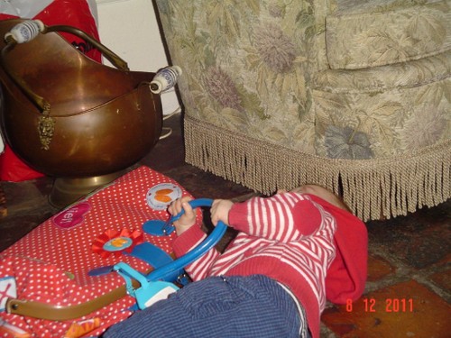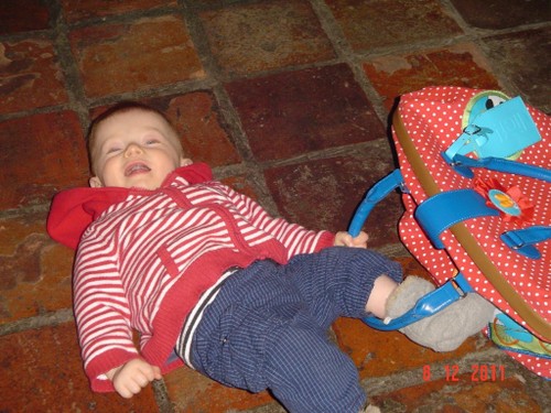 Spelen. Eerst even extra trui aan en dan spurt Bart gelijk naar de tas, hij worstelt een tijdje met dat grote zware ding, maar hij zit dicht dus iets eruit halen gaat deze keer niet. Dan krijgt hij de snoeptrommel in de gaten, hij scheurt erop af, hebbes, en bestudeert hem grondig. Ook die gaat niet open. Verder tijgeren, vandaag is dat het echte werk: vooruit trekken met armen en meeduwen met (meestal) rechter been, en 't gaat snel!!!