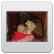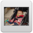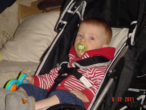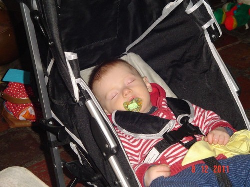 Alweer wakker. Dat was een heel kort dutje, blijf nog maar even liggen mannetje. Speelt een beetje met speen en popje, wrijft in ogen maar verzet zich toch tegen de slaap. Weer zelfde ritueel: voor het raam heen en weer rijden, zwaaiende bomen kijken en hopla, valt weer in slaap.