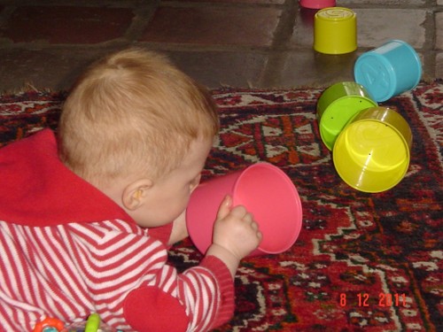 Weer verder spelen; het gaat allemaal een stuk gecoördineerder dan de afgelopen weken. Er wordt nauwelijks meer in buiklig minutenlang met armen en benen gesparteld, geen tijd meer voor, Bart verplaatst zich. Gaat doelbewust op iets af en neemt dan alle tijd om dat "iets" voorzichtig vast te pakken en te bekijken, dan er even mee timmeren/slaan/schudden en erop krassen met nagels, kijken wat voor geluid het maakt en erop sabbelen om nog beter te voelen met z'n tong. Bart heeft het druk.