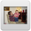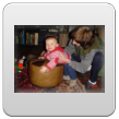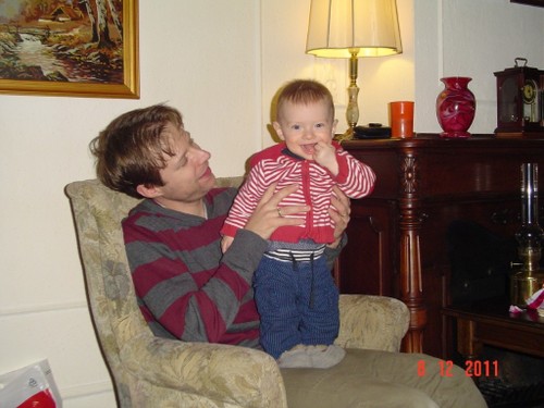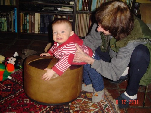 Papa is er en we onderbreken onze grond-activiteiten om de deur open te doen. Nog even op schoot terwijl papa iets drinkt en iets uit de snoeptrommel haalt (hij krijgt hem wel open!) en dan showen we nog even de poef-wip-oefening en speelt Bart nog even verder.