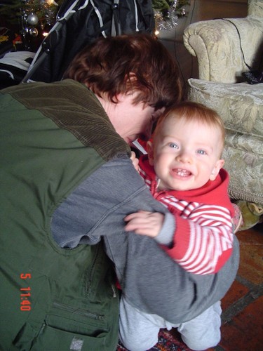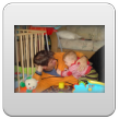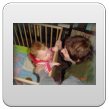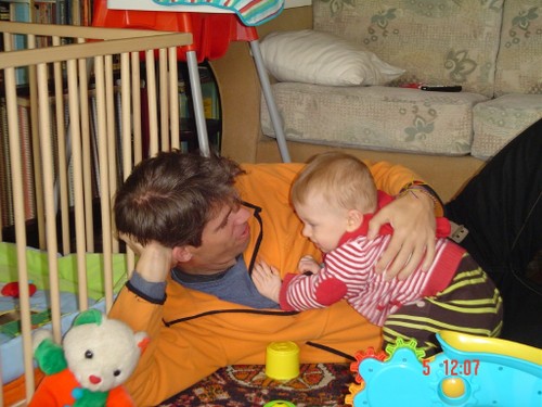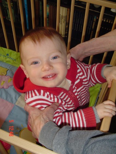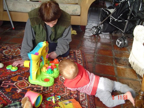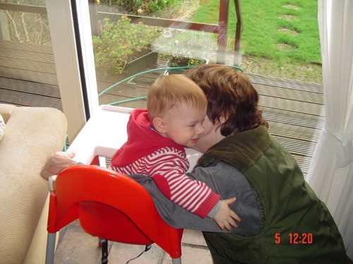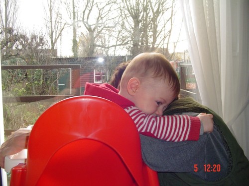 Luier doorgelekt, stom van omadien, had ze eerder moeten verschonen, maar Bart is onverstoord. Gauw schone romper en broek en verder spelen met oom Bart, die is een leuk klimtoestel. Omadien ruimt op en gaat even broodnodige koffie drinken op balkon. Dat zint Bart niet en hij gaat mopperen, dus bij oom Bart op de arm maar hij blijft mopperen. Koffie mee naar binnen (die wordt natuurlijk koud) en baasje even in de kinderstoel voor het raam, LEUK!! Timmeren op het blad en samen naar buiten kijken en babbelen.