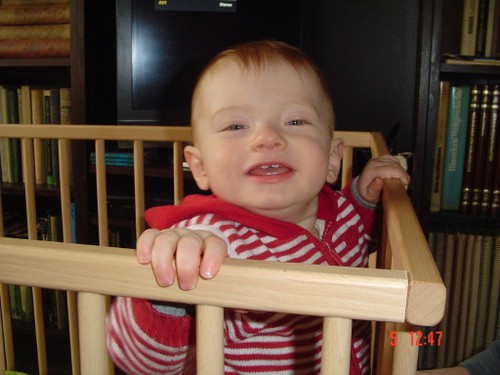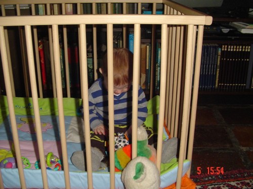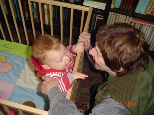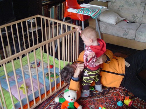 Weer wakker. Even op schoot. Bart draait z'n koppie alle kanten op: waar is mijn speeloom? Die is weg mannetje, naar Denemarken. Weer verder spelen, en dan ontdekt Bart het raam, je kunt erdoor naar buiten kijken (dan ligt hij heel stil te koekeloeren), je kunt ertegenaan timmeren, je kunt erover wrijven, dat piept leuk en je kunt eraan likken. Dan ontdekt de globetrotter dat je nog verder kunt, achter de bank, maar dat vindt omadien minder leuk, dus ik trek hem iedere keer terug. Bart vindt het best en start gewoon opnieuw in dezelfde richting. Dan maar even in de box verder spelen. Maar dat verveelt gauw dus gaat Bart het staan weer oefenen.