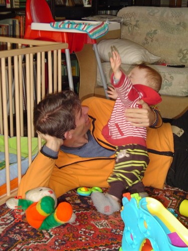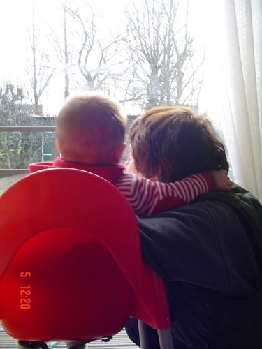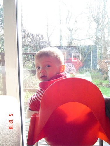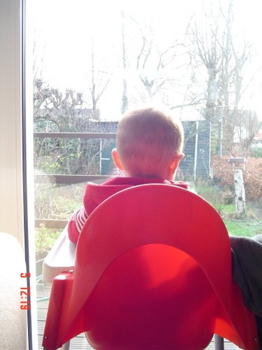 Bart zit weer met een rood hoofd te persen en knettert. Even wachten tot hij klaar is en dan een schone luier (geen poepluier) en weer spelen op het kleed. Bart dwijlt van hot naar her. Na een halfuurtje wordt hij een beetje moe, op de bank voor het raam op schoot, Bart kijkt rustig naar buiten.