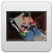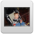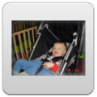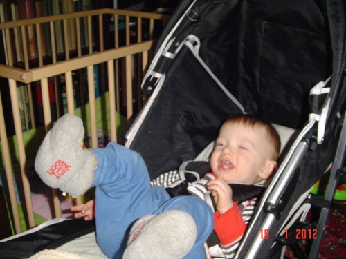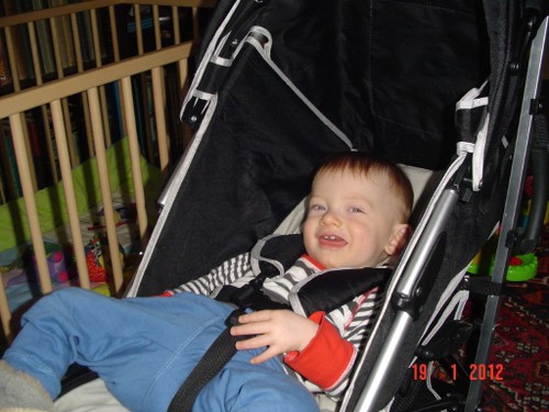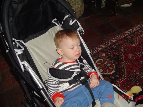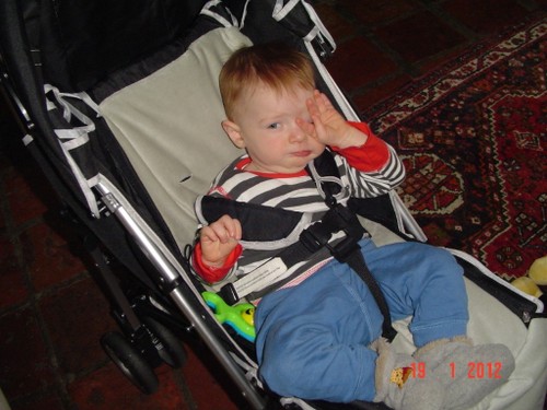 Bart wordt echt moe, legt z'n wang tegen de mijne, gauw naar de keuken in de buggy en wat drinken. Dan de buggy plat en naast de bank. Bart lacht, kletst en speelt met mijn hand. Nee dat wordt hem niet, is veel te gezellig, voor het raam dus, even heen en weer rijden en in 2 minuten vertrokken.