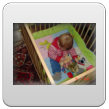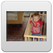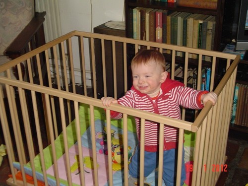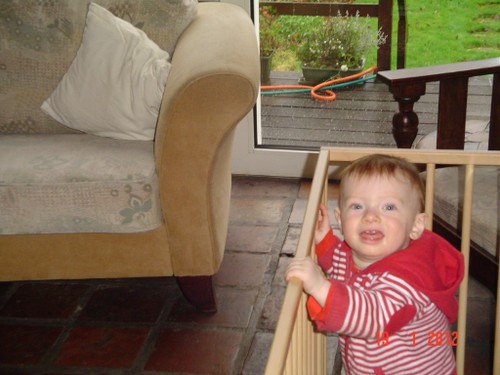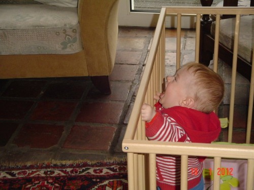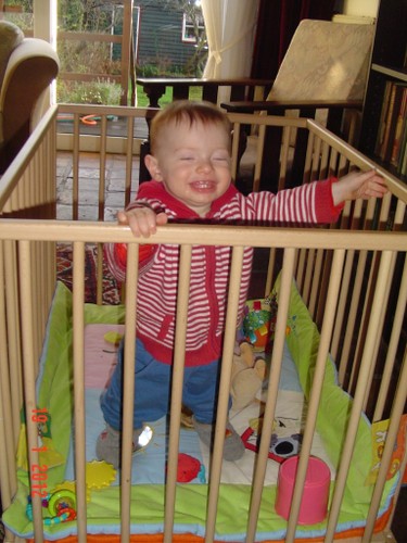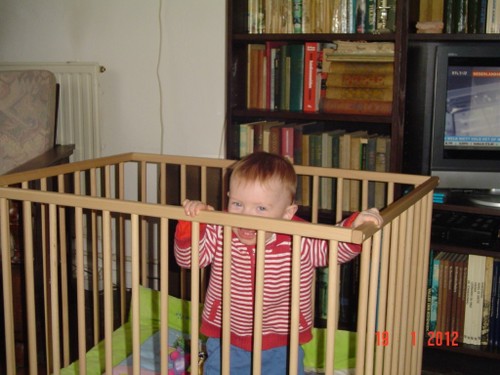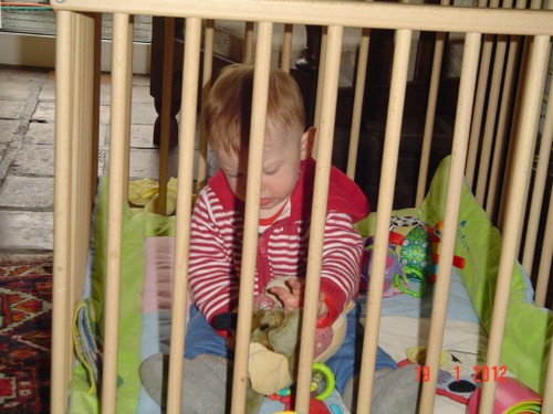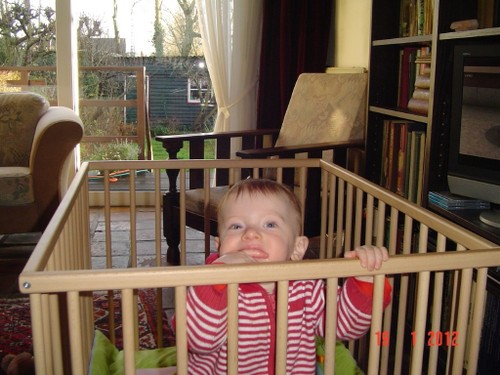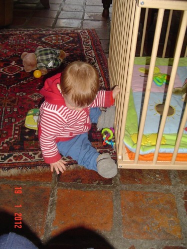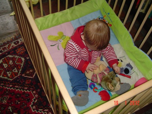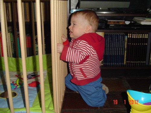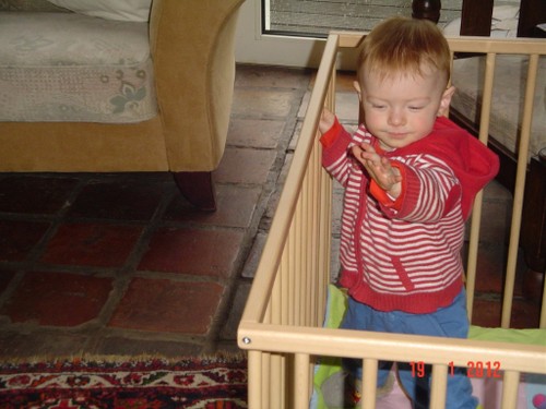 Mama uitgezwaaid en gelijk barst meneertje los. Even ballenbaan en dan naar de box: STAAN, ik zet hem op de grond, naar de tafel: STAAN, zet hem terug op de grond, naar de box: STAAN. Na een tijdje wordt hij een beetje moe want hij gaat meer wiebelen. Even afleiden met ballenbaan en boekje en nijlpaard (lekker groot). Nu ziet hij de maxi-cosy en spurt erop af: ermee bonken.