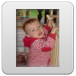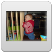 Schone luier en verder spelen. Nu ontdekt hij het draaimechanisme van de ballenbaan. Geconcentreerd draait hij met een gedecideerd handje aan het wieltje en kijkt naar het gevolg: allemaal draaiende blokjes. Heeft nog niet de truc door om het muziekje aan te zetten, ik blijf het voordoen en iedere keer weer een grote grijns. Verder tijgeren (nu met 2 benen!) en staan waar hij maar kan.