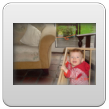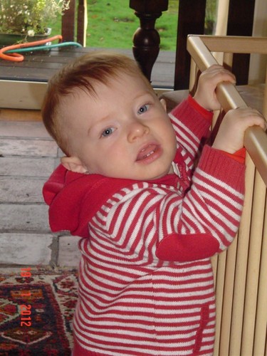 Dan naar de keuken en fles maken, Bart wacht geduldig en speelt met de smileyrammelaar, maar schrokt wel bij het drinken dus af en toe even pauze. Fles op, boertje gedaan en dan gaan we vrij worstelen op de bank: klauteren, staan, rollen, staan, rondkijken (bank is lekker hoog en dan kun je alles goed zien). Tussendoor krijg ik blubberknuffels en veeg m'n gezicht droog. Het leuke aan een bank is dat je je kunt laten vallen, is lekker zacht. Ook leuk is om op schoot op je rug liggen met je hoofd naar beneden en minutenlang de kamer ondersteboven bestuderen. Als afwisseling minutenlang de mogelijkheden van het lopertje van een rits uitproberen is ook leuk. En alles wordt begeleid door commentaar en gekraai.