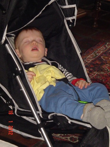 Het is mooi geweest baasje, in de buggy. We gaan fruithap maken en opeten in de keuken. Daarna is Bart erg moe, voor het raam? nee, Bart moppert, naast de bank dus, Bart grijnst, gekke goser. Even Alfred J. Kwak kijken, maar na een paar minuten wrijft hij in z'n ogen en kijkt heel lodderig. Tv uit, even heen en weer rijden en oogjes zakken dicht.