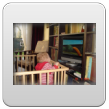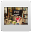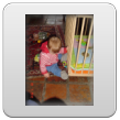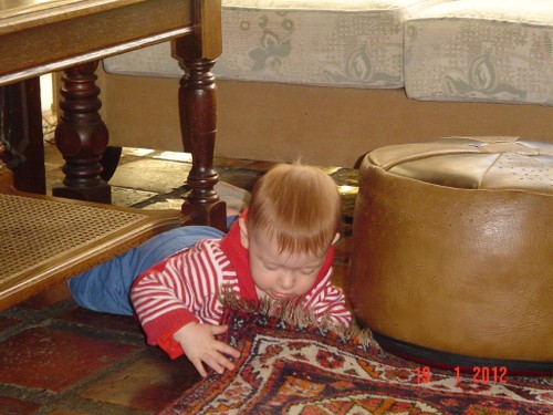 Wakker, nog even in de buggy bijkomen, tekenfilm kijken en spelen met rammelaar. Grijns-grijns-grijns-ba-ah-uf. Op schoot even knuffelen, wat drinken en vrij worstelen en dan verder op het kleed. De poef is een aardige afleidingsmanoeuvre, je kunt er bij gaan staan (niet zo hoog en je bovenlijf kan er op liggen) en je kunt er mee worstelen en da's ook leuk, hoe groter hoe beter. De poef gaat meters de kamer door. Dan verder met de snoeptrommels en de ballenbaan.