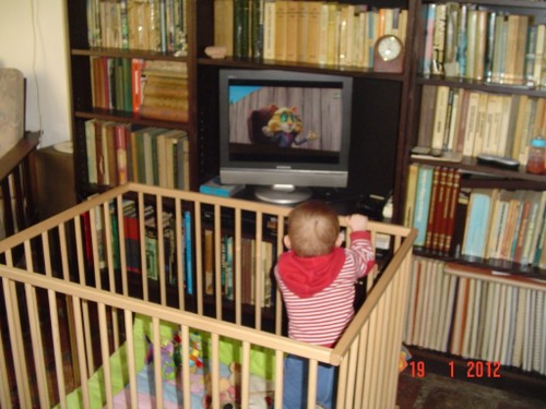 Hij kijkt al staande een tekenfilm en levert commentaar.