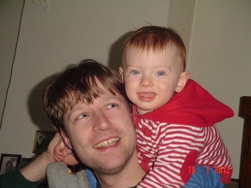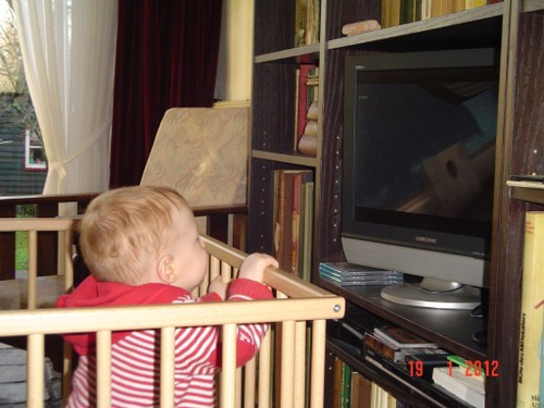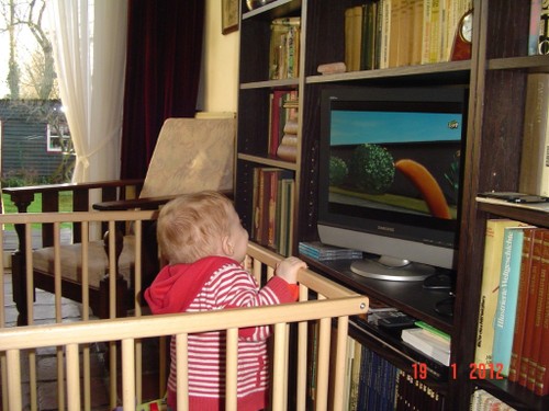 Nu maar even pauze, ik zet muziek op en Bartus op schoot. Kijkt heel verbaasd en grijnst. Bart gaat staan-zitten-staan-zitten en ondertussen draait z'n koppie van de ene speaker naar de andere en kijkt me dan aan: waar is die zingende mevrouw? kan haar wel horen maar niet zien. Dan zit Bart stil te luisteren.