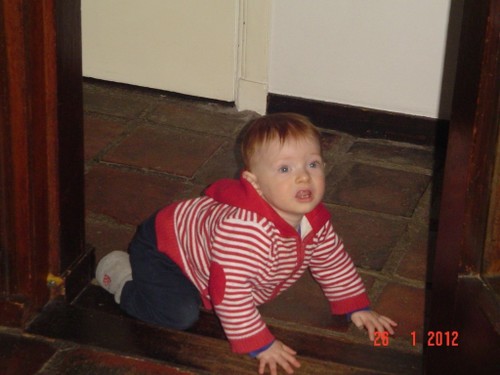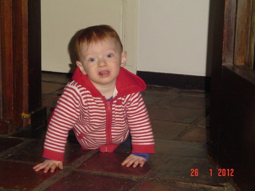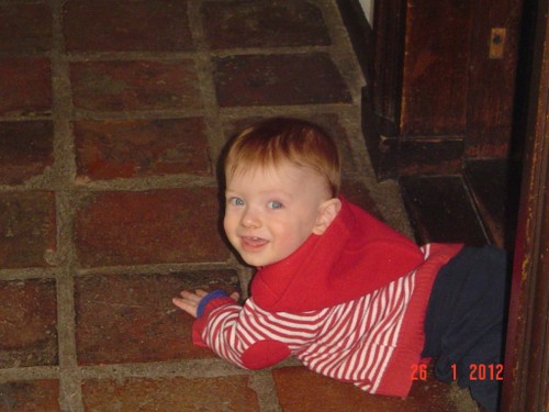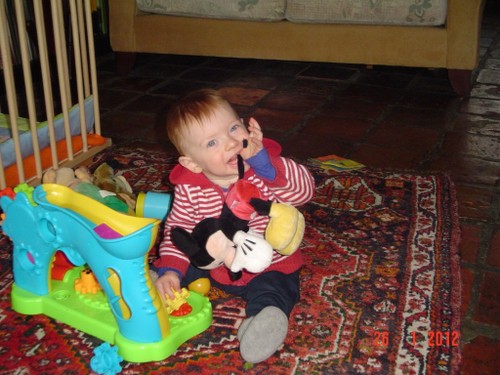 Beweging! Handje krabbelt aan de bekleding en Bart kijkt me glazig aan. Langzaam wordt hij helemaal wakker en grijnst. Gauw naar de keuken fles maken, Bart wacht geduldig, maar schrokt daarna wel, dus even pauzes inlassen. Daarna spelen op schoot: staan, kruipen, vallen en kraaien als ik gekke bekken trek. We hebben lol!