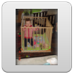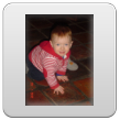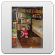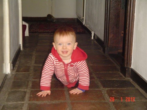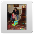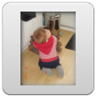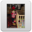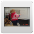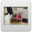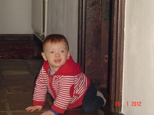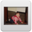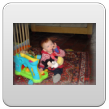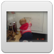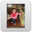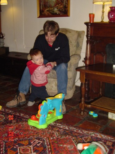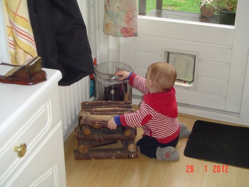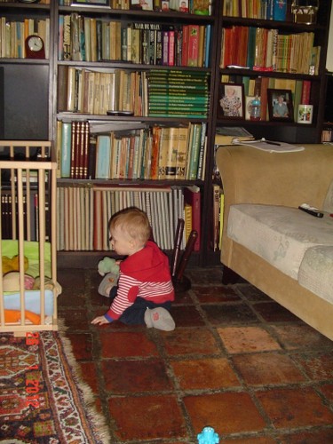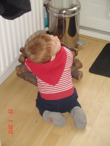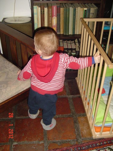 Papa is er. We demonstreren nog even de tocht naar de keuken en het onderzoek van het katteluik en het lopen met de buggy. Papa gaat wat drinken en Bart probeert weer verboden fotoboeken te pakken. Nu hou ik voor het eerst z'n handje tegen i.p.v. mijn hand tegen de boeken te houden en dat maakt Bart nog gedecideerder: pakken die dingen! Oeps, fanatiek, afleiden dus. Dan nog wat spelen met papa en foto's kijken.