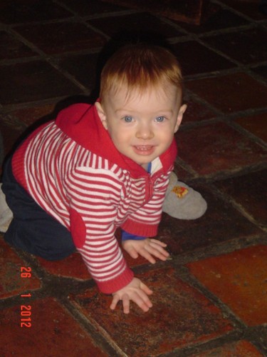 Ik ga de fruithap maken in de keuken, protest uit de box, maar wanneer ik terugroep uit de keuken is de communicatie hersteld en kletsen we op afstand. In de kinderstoel lekker smikkelen en naar buiten kijken. Verder spelen, Bart ziet de buggy nog staan en spurt er natuurlijk op af. We gaan hem dus maar samen achter de bank zetten, Bart houdt zich vast aan de buggy en samen gaan we lopen. En dat gaat al een stuk beter, keurige afwisseling tussen li. en re. voet en circumductie is er vrijwel uit. Echte gevoel is er nog niet, want af en toe vergeet hij z'n voeten mee te nemen. We oefenen een paar minuten, Bart kraait en kijkt me grijnzend aan.