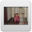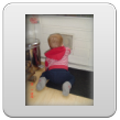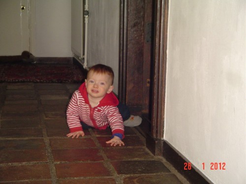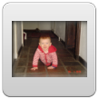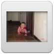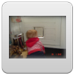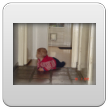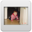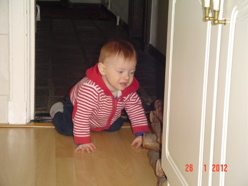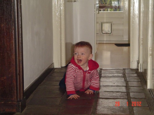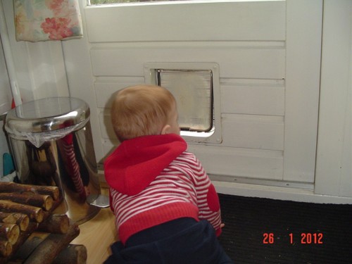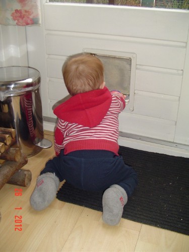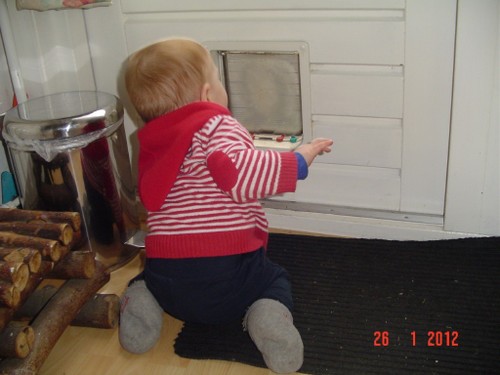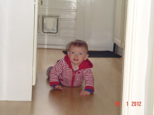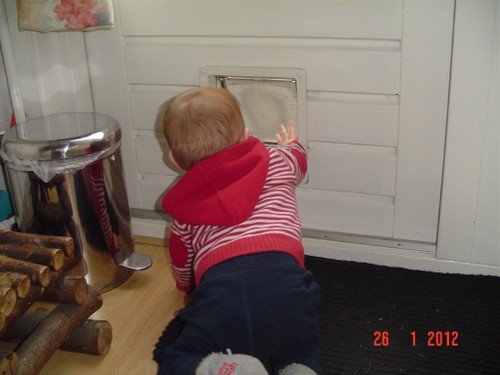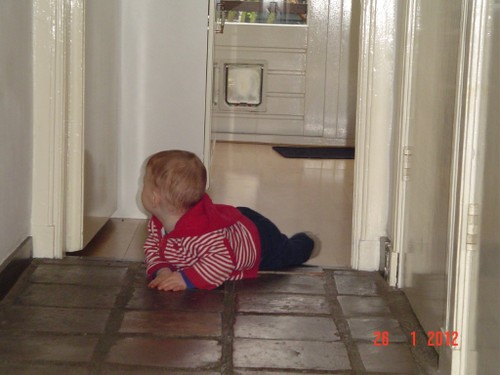 Weer spelen op het kleed, maar de fles moet ook schoongemaakt dus ik vraag Bart of hij meegaat naar de keuken, is wel zo gezellig i.p.v. in de box geparkeerd worden. En ja hoor, Bart wil wel. We gaan op weg: ik loop steeds een paar meter verder en Bart komt me achterna gekropen. In de deuropening twijfelt hij toch nog even: links of rechts? Als ik hem roep slaat hij toch maar linksaf richting keuken. Daar ga ik schoonmaken, Bart kruipt achter me langs naar "het glimmende ding" en wil daarmee gaan hannesen (= omgooien). Lijkt me geen goed idee, Bart onder de smurrie uit de pedaalemmer, dus doe ik hem voor hoe het katteluik werkt. AHA, NOW YOU'RE TALKING !!! Schot in de roos, ik kan rustig opruimen en een boterham eten terwijl Bart zich wijdt aan het onderzoek en de werking van het bewuste luik: openduwen, handje naar buiten, hé dat voelt anders, handje terug, luik gaat heen en weer en staat stil, nog een keer en nog een keer - een bijzondere ruimtelijke ervaring. Dan wordt het tijd om terug te gaan naar de kamer. Met moeite krijg ik Bart weg bij z'n onderzoek en we gaan weer op weg.