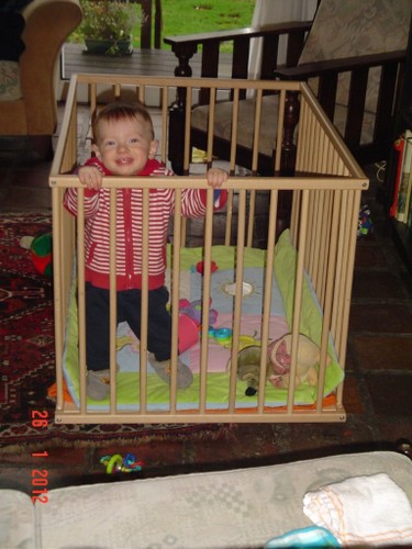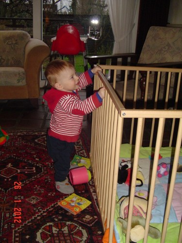 Bart attakeert de poef, die nu tussen de box en de stoel staat om de boekenkast te beschermen. Dat had je niet moeten doen omadien. Bart ligt met z'n bovenlijf op de poef, grijpt de boxspijlen, trekt zich op, beentjes op de stoof en daar staat hij, King Bart bovenop de poef. Hij glorieert: da's pas hoog en zelf gedaan. Z'n linkerbeen gaat nu naar beneden en dan staat hij alsnog voor de boekenkast. Geen goed idee baas, dus weer midden op het kleed. Maar Bart heeft nu de smaak te pakken, er is nog een stuk boekenkast aan de andere kant van de box, het stuk met fotoboeken, daarheen dus. Aanval wordt geopend, nee mag niet, is van omadien, ik houd mijn hand voor de boeken maar Bart houdt vol, nee is van oma, nog een keer en nog een keer tot Bart er genoeg van krijgt en gaat mopperen, dus op het kleed, ballenbaan en muziekje, grijns, grijns. Dan klimt Bart weer tegen me op, wil op schoot, knuffelen, met mijn gezicht spelen, ik maak gekke geluiden en doe happebuik, Bart schatert. Na een tijdje gaat hij rustig zitten luisteren naar de liedjes, we zingen en wiegen mee.