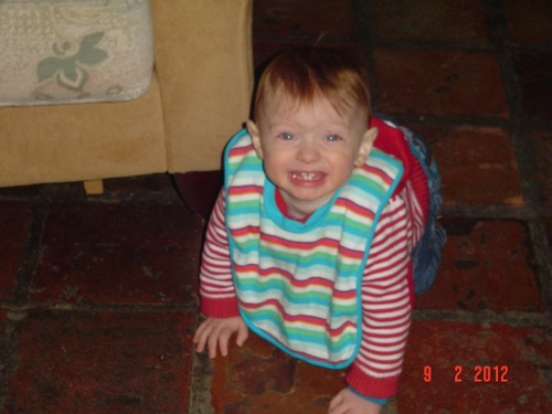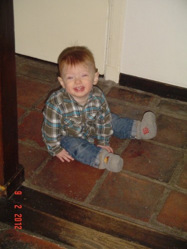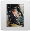 Kom maar weer in de kamer mannetje, we spelen even op het kleed maar Bart wordt al gauw mopperig en wrijft in z'n ogen. Kom maar mee dan, drinken in de keuken. Bart kruipt achter me aan en drinkt in de keuken halve fles leeg, heeft dorst. Daarna is hij nog mopperiger, in de kamer op schoot. Hm, koppie is gloeieriger dan daarnet. Bart gaat nu hard huilen en kronkelt, wil niets en grijpt naar z'n hoofd. Even heen en weer lopen en voor in de stoel uit het raam auto's kijken. Bart kalmeert en sabbelt op mijn kraag met de klittenband. Zakt langzaam weg, nee da's geen fit Bartje. In de buggy, Bart huilt weer even, sabbelt dan op de bijtring en valt in slaap. Heeft ijskoude handen, ook wat vlekkerig. Trekt af en toe met armen en benen.