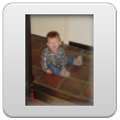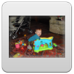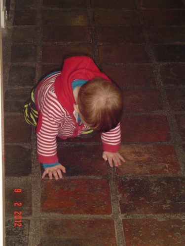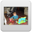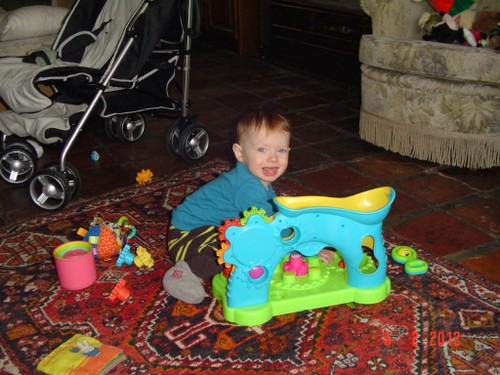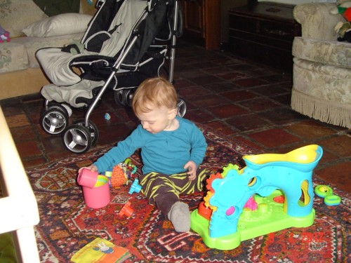 Ik wil net mama sms-en in de keuken als hij weer huilend wakker wordt. Hij ruikt naar poepie, dus eerst maar weer een schone luier. Nee, luier is nog droog, even tempen: 37.5, dat is beter. Oeps telefoon gaat, even opnemen met Bart in blote kont. Da's mama, ik vertel het goede nieuws en dan zet Bart z'n fonteintje aan: alles nat. Luistert nog even naar mama, maar probeert dan telefoon te pakken. Daarna verschonen en in de buggy naar de keuken rijstebloempap maken (120) en vruchtensap (banaan/wortel) drinken. Bart lacht weer. Pap op, spelen op schoot, lijf gloeit veel minder. Dan weer spelen op het kleed met de ballenbaan, lachen, kletsen. Bart is weer bij de tijd! Hij gaat staan bij de tafel en dan ziet hij de beren in de stoel liggen, daarheen en hopla, de 1 na de ander wordt uit de stoel geknikkerd. Opeens spurt hij richting keuken, ik ga erachteraan, we gaan opruimen. Bart speelt met de stoof, de mat en trommelt op de pedaalemmer. Katteluik is dicht dus geen lol aan. Ik maak de flessen schoon. Kom Bart, we gaan weer naar de kamer, tap-tap-tap, Bart kruipt achter me aan, mooie ritmische motoriek! Verder spelen op het kleed, veel staan.