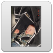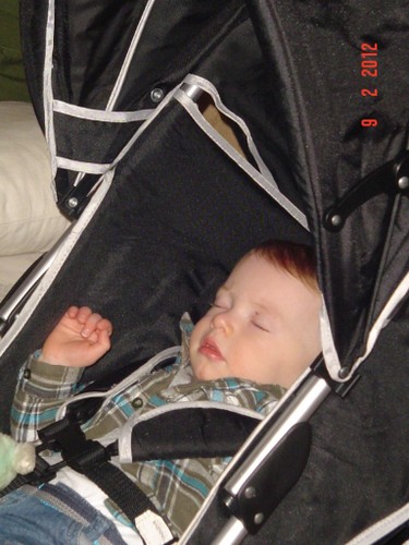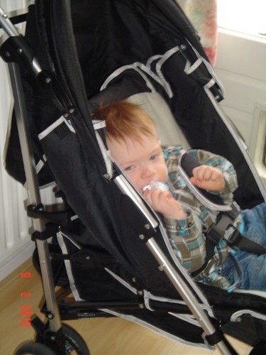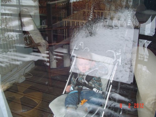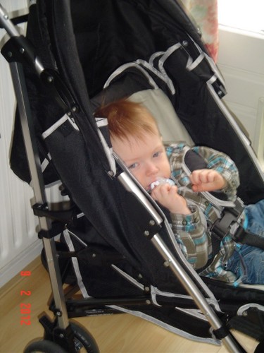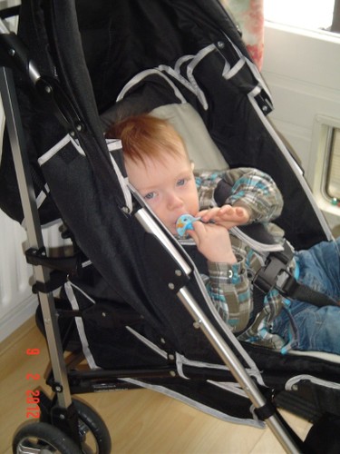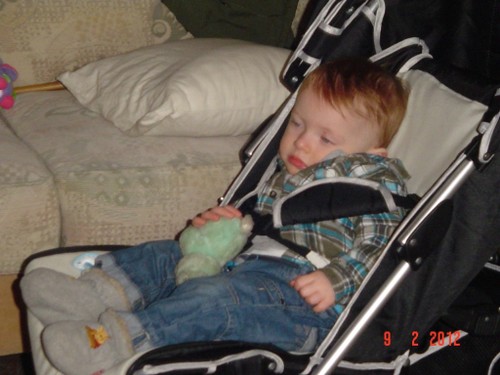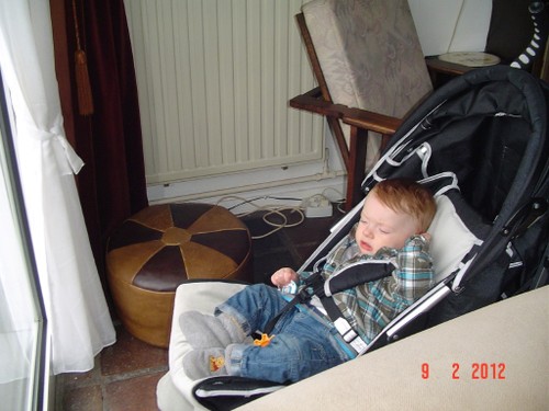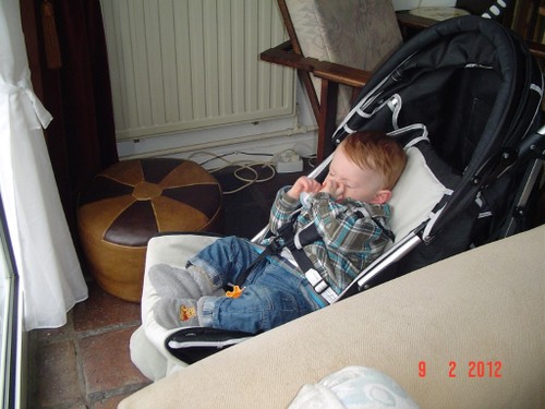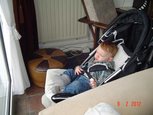 In de buggy met gele lap. Handen koud, oren wit, mannetje is nog niet fit. Voor de tv, ogen wrijven, geeuwen. Buggy plat, tv uit, heen en weer rijden.