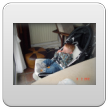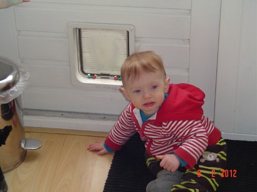 Er staat een poes te loeien in de gang, Bart scheurt op het geluid af, bij de deur hou ik hem tegen. Poes zit inmiddels op de trap te loeien, Bart vindt het duidelijk een bijzonder fenomeen en ze kijken elkaar minutenlang aan, Bart met grote ogen. Weg is de kat. Terug naar het kleed, nee, Bart wil kijken waar poes is en kruipt terug en kijkt om de hoek van de bank. Dan maar even samen voor het raam vogels kijken die de broodkruimels komen eten. Bart begint weer in z'n ogen te wrijven.