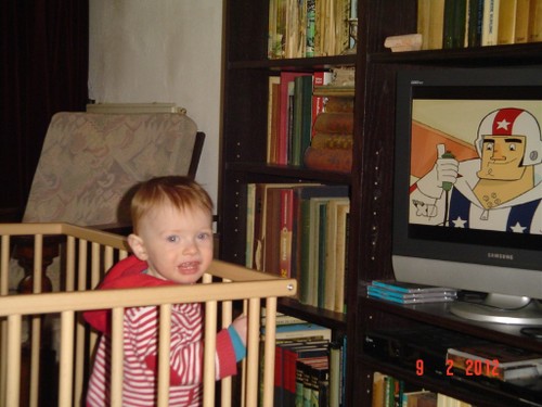 Verder spelen in de box, staan, wiebelen, tekenfilm kijken.