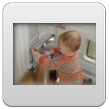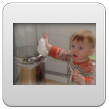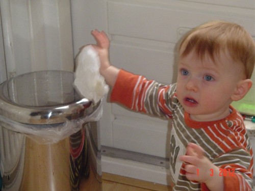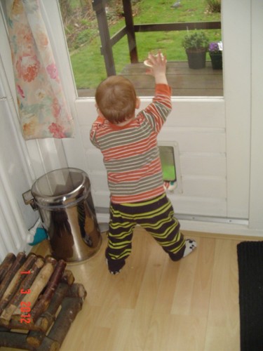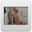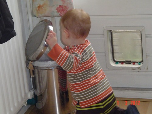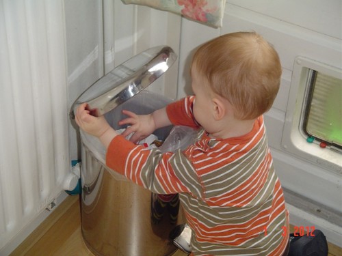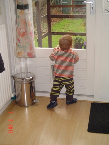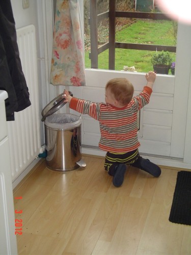 Wakker, weer een korte dut. Ik laat hem nog 10 minuten liggen, af en toe heen en weer rijden. Noppes, Bart kletst en grijnst en wil echt niet meer slapen. Even op schoot en muziek aan. Na een paar minuten samen naar de keuken boterham en fruithap maken. Bart trekt zich steeds op aan m'n been om te kijken wat ik aan het doen ben. Vanuit de buggy kun je dat natuurlijk zien en vanaf de grond niet, hij staat op z'n tenen om beter te zien. Ga je mee eten? Bart stuift achter me aan; in de kinderstoel voor het raam lekker opeten en ondertussen vogels kijken en wijzen: ggg, ggg, ja vogels, gg-gg. Dan haal ik met pincet gauw even groot stuk uit z'n neus, voordat hij kan protesteren is het al klaar en Bart kijkt gefascineerd naar het onsmakelijke ding. Zo, nou kun je weer ademen baas. Schone luier en samen naar de keuken opruimen. Bart houdt zich bezig met katteluik en pedaalemmer. Potdorie, ineens zit hij met een broodkorst in z'n mond, uit de pedaalemmer gehaald. Kan nu dus 2 dingen tegelijk: deksel met ene hand openhouden en met andere hand iets eruit pakken. En nog een keer, nu een zakdoekje, èè-èè-nee-bah. Bart kijkt me vragend aan, terug, deksel dicht. Nog een keer, weer de broodkorst, hup naar z'n mond, hij weet donders goed wat eetbaar is en wat niet. Nee-nee, terug. Nog een keer, èè-èè, Bart zet door en probeert weer met duim en wijsvingertje te plunderen. Genoeg, ik draai de emmer om, hij krijgt het deksel nu niet meer open; volgende keer emmer naar buiten.