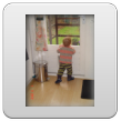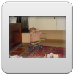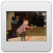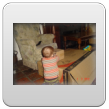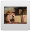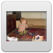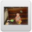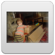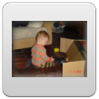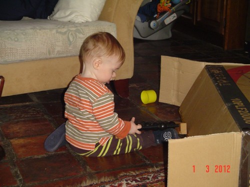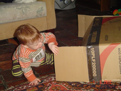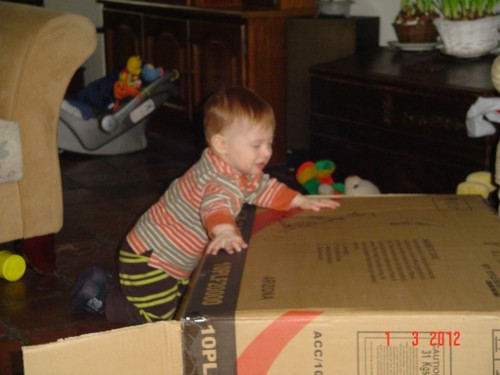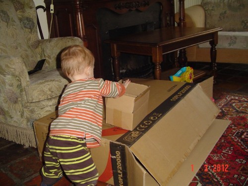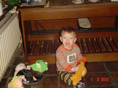 Ik ga terug naar de kamer en roep Bart: kom je? De boef gaat zitten nadenken, veel te leuk in de keuken, ik pak vlug de roosvicee en daar komt hij op af gestormd. Even wat drinken en dan spelen met de dozen, Bart kletst, klautert, kruipt, staat.